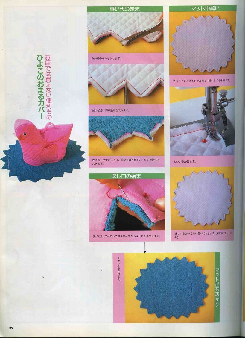 Где стоят детские горшки? В туалете или в ванной, вероятно, скажете Вы. Но разве они всегда там? Вспомните, как часто они находятся в комнате, в коридоре или на кухне, где мы успеваем его схватить и прибежать к малышу. Мы обеспечиваем «легкую доступность» позволяя ребенку быстрее освоить этот важный предмет. Вид горшка не всегда нам нравится т. к. он совсем не вписывается в интерьер квартиры. Можно это исправить! В одном из детских журналов я подглядела замечательную идею помогающую спрятать горшок. Посмотрите на этот замечательный чехол в комплекте с ковриком. Даже не умея профессионально шить и не зная китайского языка, можно справиться с этими выкройками. Надеюсь, Вам пригодится эта веселая желтая курица!