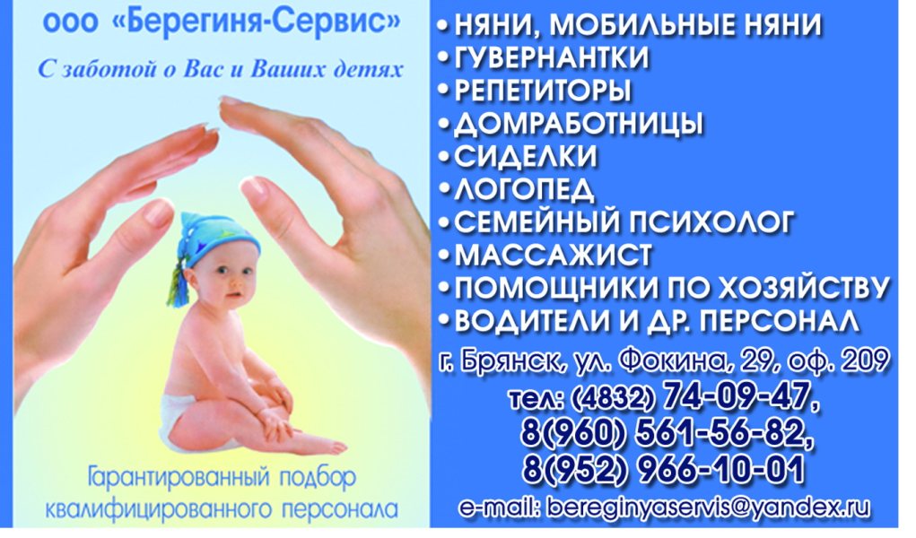 В октябре 2004 в городе Брянске была образована общество с ограниченной ответственностью «Берегиня-Сервис». На протяжении всего время работы нашей компания сохраняет высокий уровень по предоставления и подбору квалифицированного персонала. Мы гарантируем качество на предоставляемые услуги.