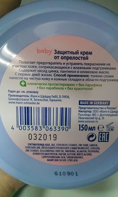 Ложится на кожу крем и расходится по ней легко, что даже немного удивляет в виду его густоты. Хорошо и основательно впитывается, никаких следов в виде пленки или жирных пятен на вещах не остается. Пишу и про одежду, потому что применяю крем не только как основу под памперс. Согласна с мнением других мам – саносан прекрасный лекарь, я смазываю им раздражения, независимо от того, в каком месте на теле они появились. Помогает быстро, шелушения, небольшие покраснения, мелкие высыпания исчезают за считанные часы. Был у нас печальный случай, передержали ребенка в мокрых подгузниках. Когда сняли, перепугались всей семьей – попка и область между ножками просто полыхали красными пятнами. Я помыла сына, аккуратно промокнула и после получаса воздушных ванн смазала все это саносаном. Через несколько часов повторила, а при следующей процедуре попка выглядела уже не так устрашающе. Чуть больше суток и проблема была устранена.