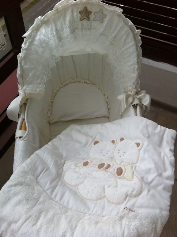 Эта люлька - переноска в белом цвете, пришла в комплекте с подушечкой, одеялком, матрасиком - материал хлопок. Мягкий, плотный. Запахов посторонних не было. Недаром хвалят итальянские детские бренды за экологичность. Люлька для сна имеет возможность как переносится в ручную, так и стоять на подставке, но подставку мы заказали позже. Отдельно. Доплатили 8 тыс. рублей, подставка пришла деревянная. Воздух циркулирует хорошо внутри люльки, чтобы не говорили (это я к тому, что есть убежденные, что воздух плохо проходит к ребенку в таких люльках). При желании капюшон можно и опустить, он складывается. Я уже говорила, что база для люльки деревянная, из лозы ивы. Люлька нам обошлась в 17 тыс.250 руб без стоимости доставки. У нас Italbaby, называется Angioletti.