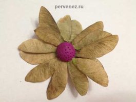 Заготовьте их впрок, чтобы холодными вечерами было чем заняться. А пока сделаем цветок с семенами клена. Эта поделка хорошо подойдет даже для самых маленьких детей.