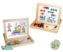 - доска двухсторонняя, рамка не окрашенная, размером 41х32,5 см, одна сторона предназначена для мела, другая - металлическая окрашенная для рисования, писания маркером и для использования магнитных мозаик, а также для букв цифр и знаков;