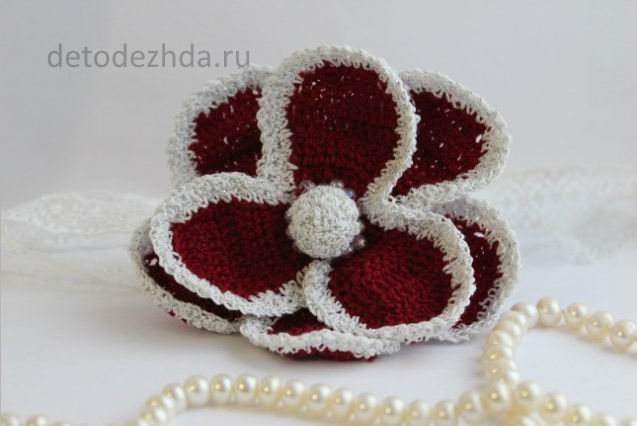 Вязаные цветы на заколках или резинках всегда очень красиво и изысканно выглядят на волосах. Крупный бордовый цветок, украшенный бусинами и серебристой окантовкой, украсит любую прическу и подойдет как для праздничного наряда, так и для будничного образа.