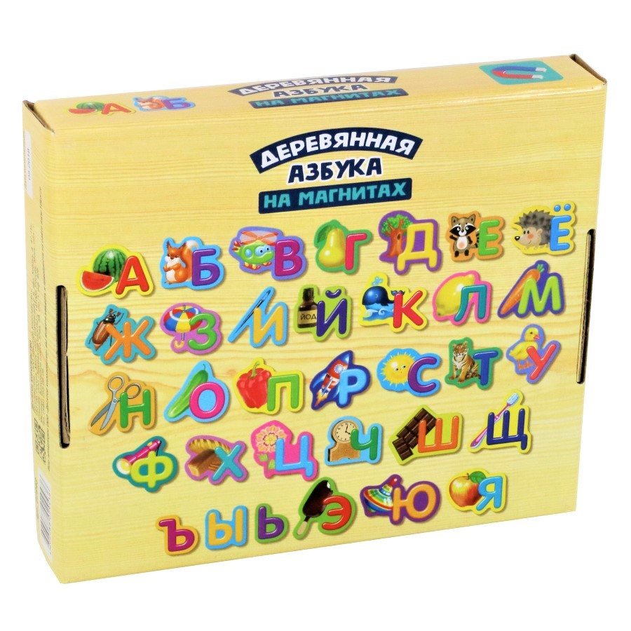 Деревянная азбука на магнитах рекомендована детям старше 3 лет для начала изучения букв русского алфавита.