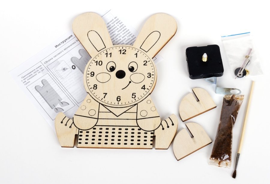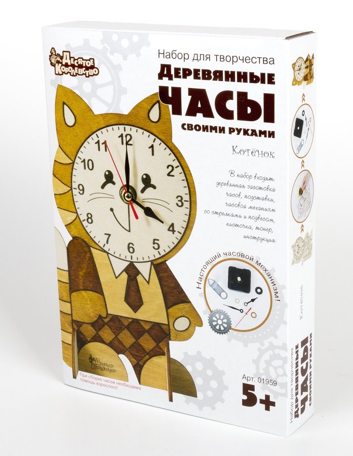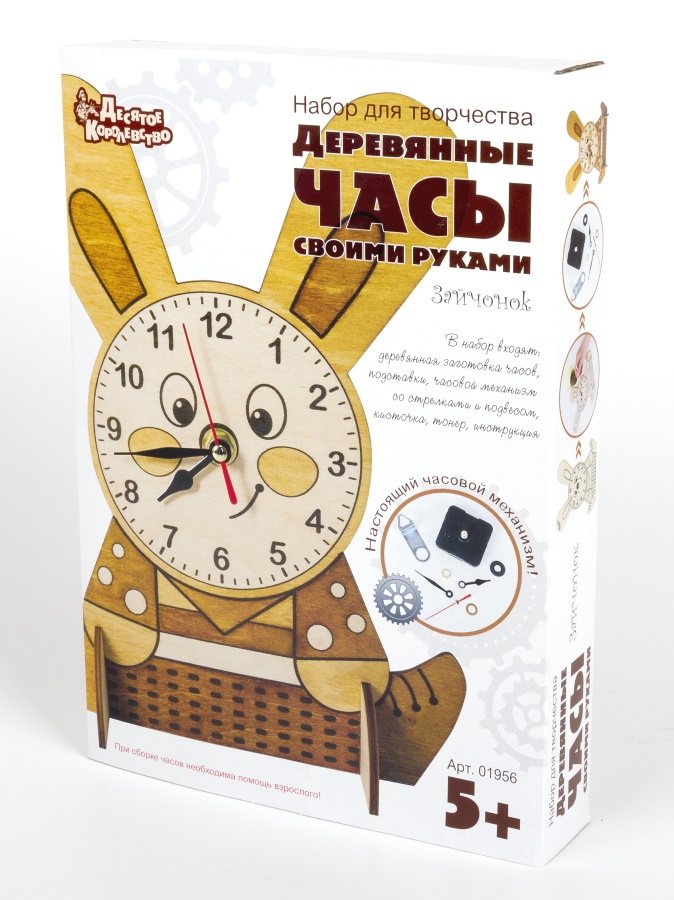 Специально с этой целью компания «Десятое королевство» выпустило серию «Деревянные часы своими руками». Пока в ней только четыре товара: артикулы 01956 «Зайчонок», 01957 «Медвежонок», 01958 «Ёжик», 01959 «Котёнок». Чем они хороши?