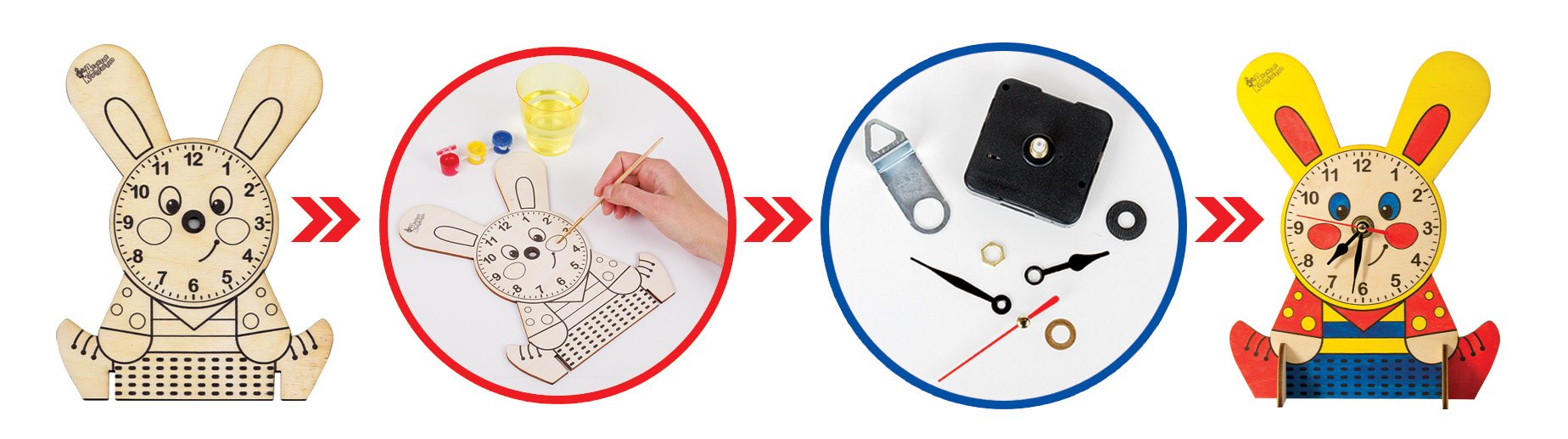 Первое – рекомендованы для детей начиная с 5 лет. Им вполне под силу разукрасить симпатичных зверушек с мордочками-циферблатами, но установку часового механизма лучше доверить родителям.