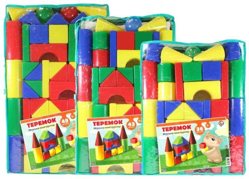 Новые строительные наборы «Теремок» 36 деталей, 43 детали и 49 деталей мы поместили в долговечную и прочную ПВХ сумку с замком, что очень удобно для хранения, транспортировки и поддержания порядка в детской комнате.