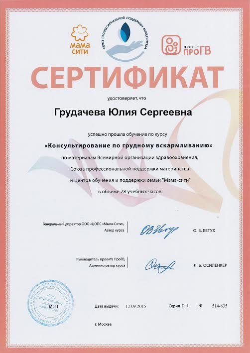 Успешно прошла обучение по курсу «Консультирование по Грудному вскармливанию» по материалам «Всемирной организации здравоохранения», Союза профессиональной поддержки материнства и Центра обучения и поддержки семьи «Мама-сити». Образование высшее. Собственный совокупный стаж кормления грудью 3 года. Мама двух замечательных дочек. Консультирование кормящих мам осуществляю на протяжении 3 лет. Профессиональное обучение окончила в 2015 году.