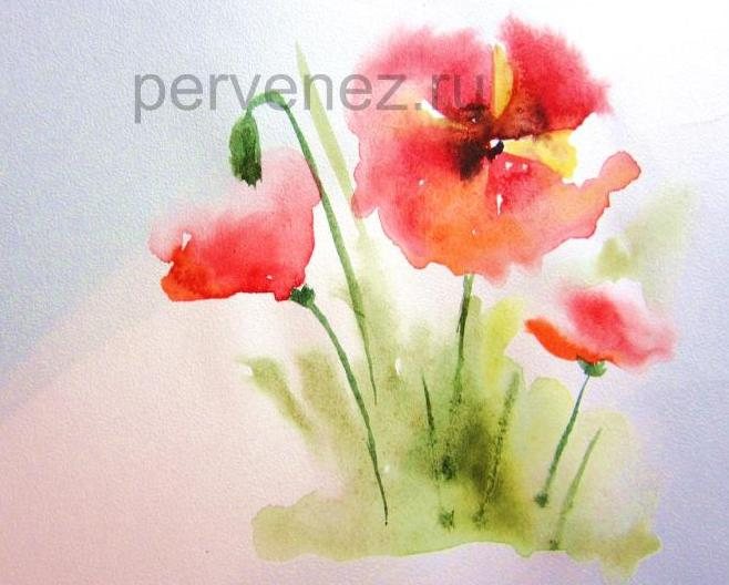 бумаги заготовку для открытки и нарисовать на ней цветы. Маки, нарисованные