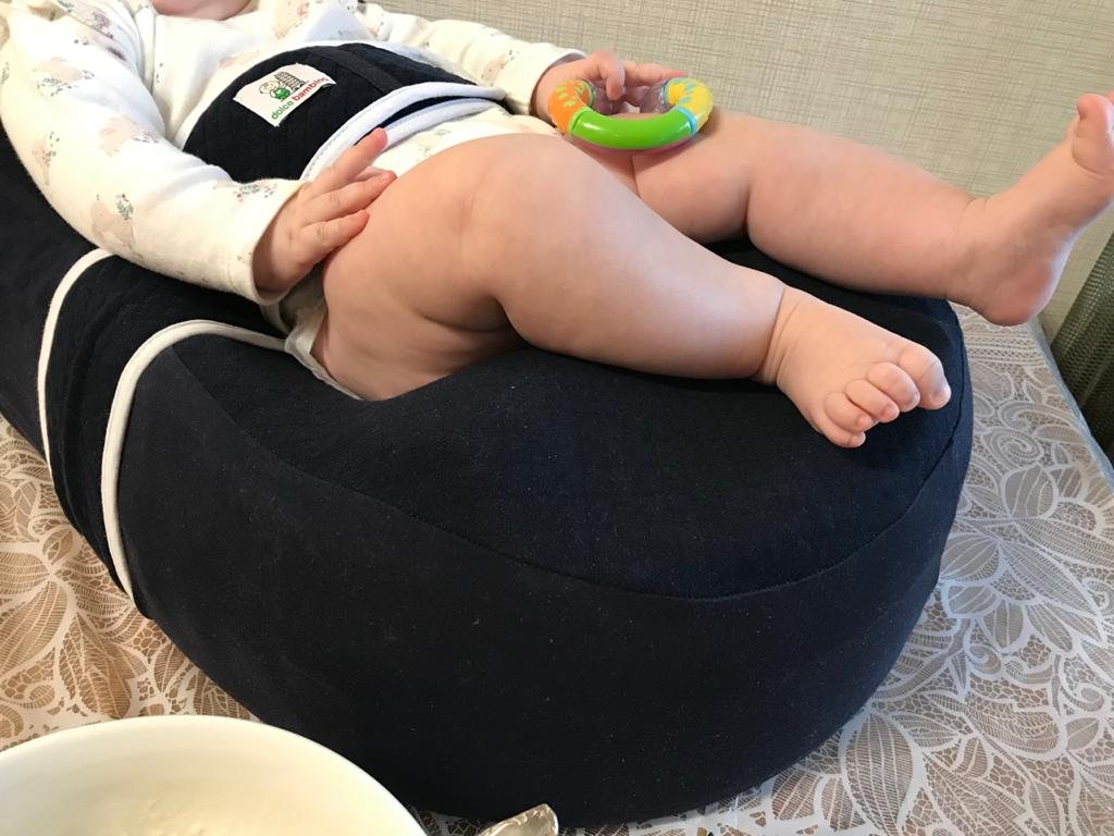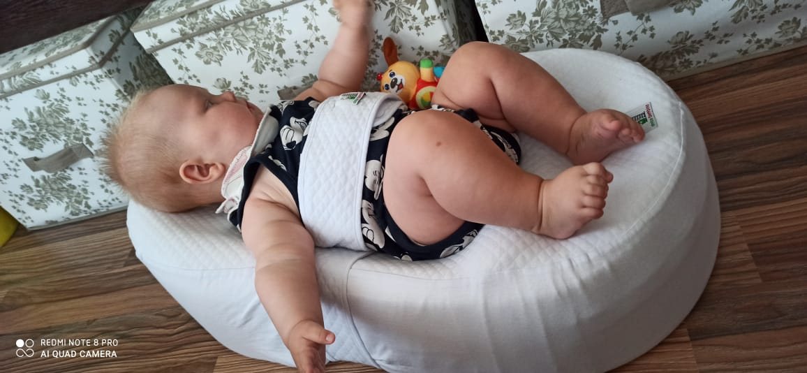 Дочка в нем не скована, запросто болтает и руками, и ногами. А вот перевернуться или упасть с матрасика у нее даже при всем желании не получится. Дно матраса широкое, он устойчив на любой ровной поверхности. А в самом матрасике дочку удерживает пояс.