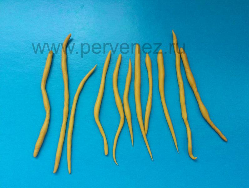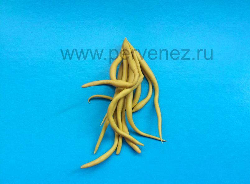 9. Скатайте каждый кусок в ладошках до состояния тонкой колбаски. Это будут щупальца морского обитателя.