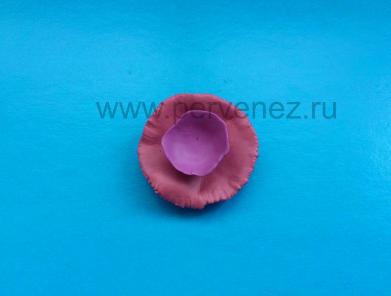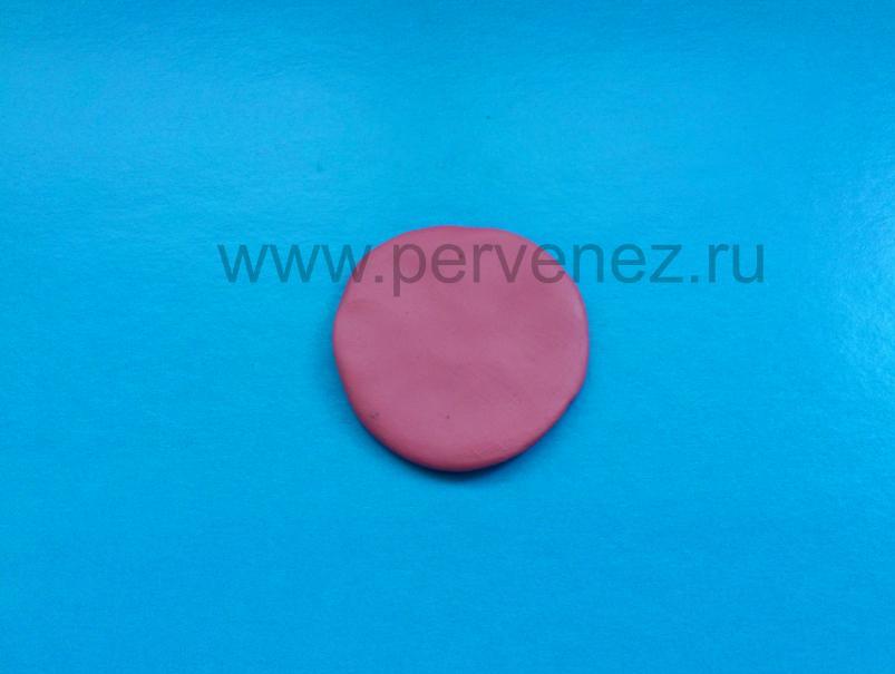2. Из розового пластилина сформируйте круглую лепешку, придавив шарик пальчиками, а затем всей ладошкой.