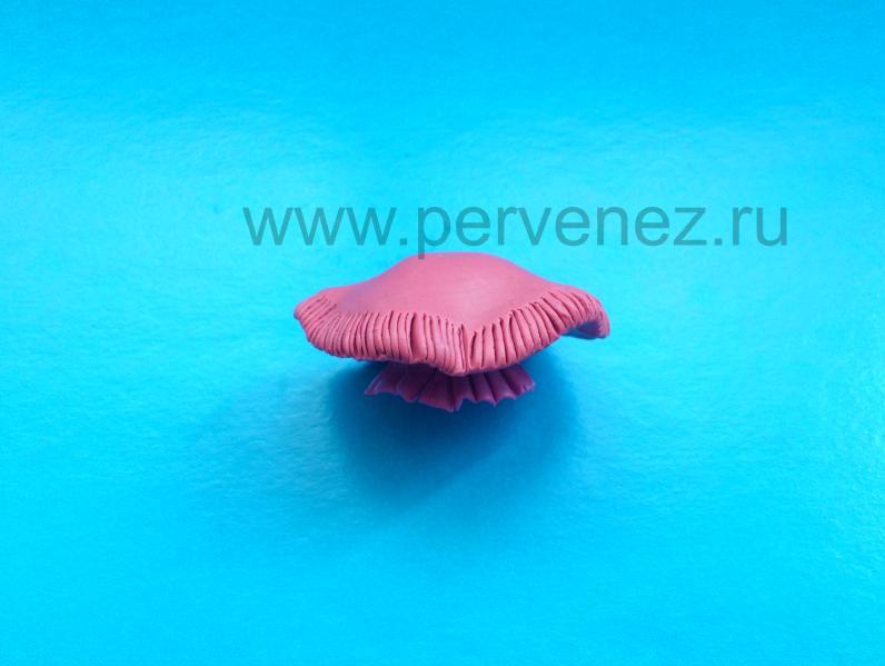 6. Соедините шляпку и юбочку. Верхняя часть медузы готова.