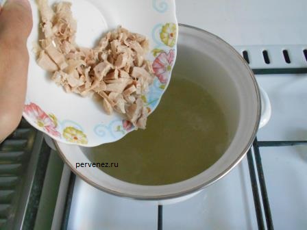 Бульон варим, используя куриную грудку или филе, чтобы он получился нежирным. Если будете варить другие части, то следует довести бульон до кипения и слить воду, затем заново набрать новую и поставить варить.