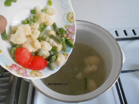 Даем немного покипеть и отправляем туда же замороженные овощи. Они могут быть любыми. В моем варианте это цветная капуста, горошек, фасоль, болгарский перец.