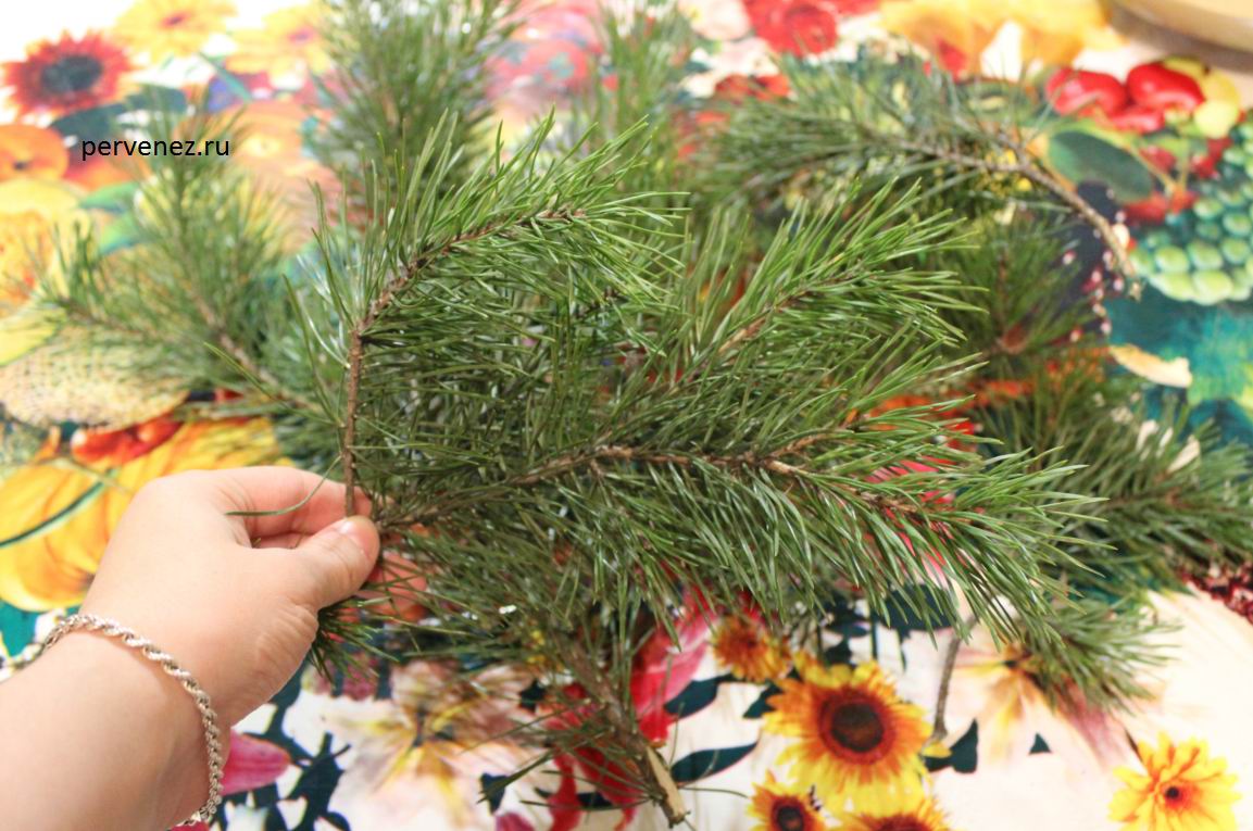 Сделать хвойный букет к Новому году можно не только из еловых веточек, но и из сосновых. Они гораздо пышнее и смотрятся ничуть не хуже. Срезанные ветки подравниваются под ту длину, которая задается для будущего букета:
