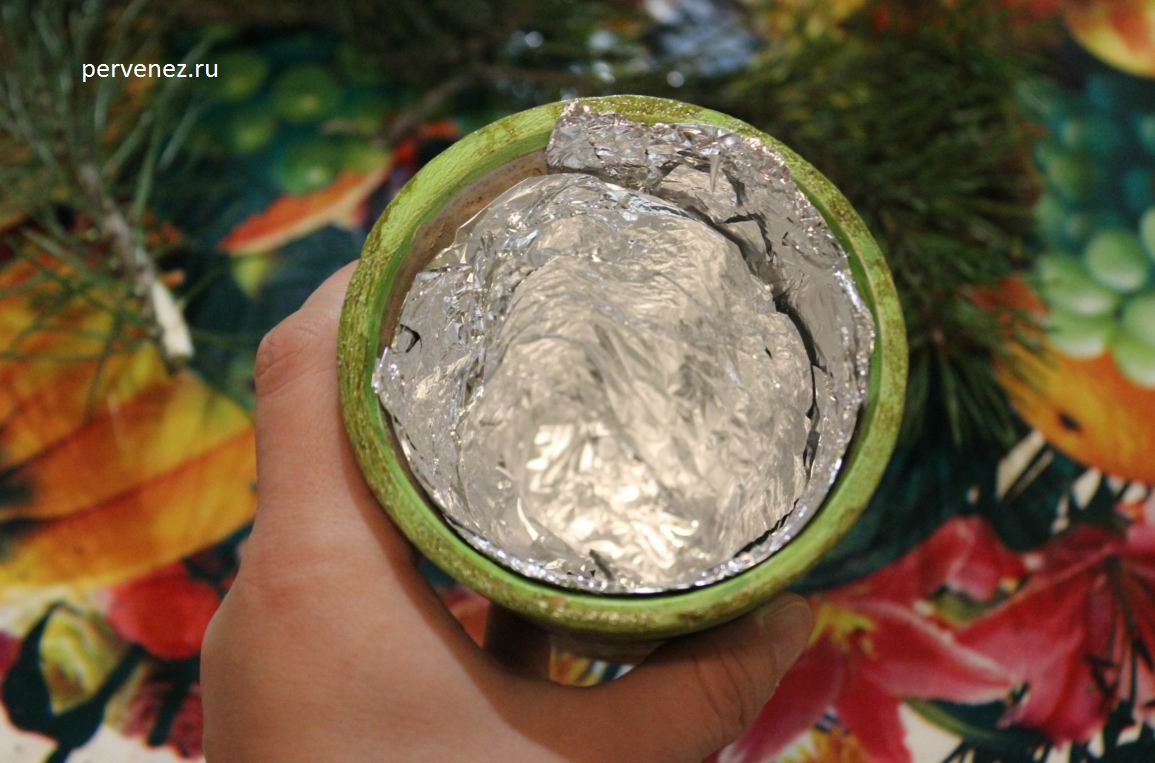 Дно и стенки горшочка тщательно выстилаются парой слоев фольги. Это необходимо для того, чтобы вода из букета не вытекала на стол.